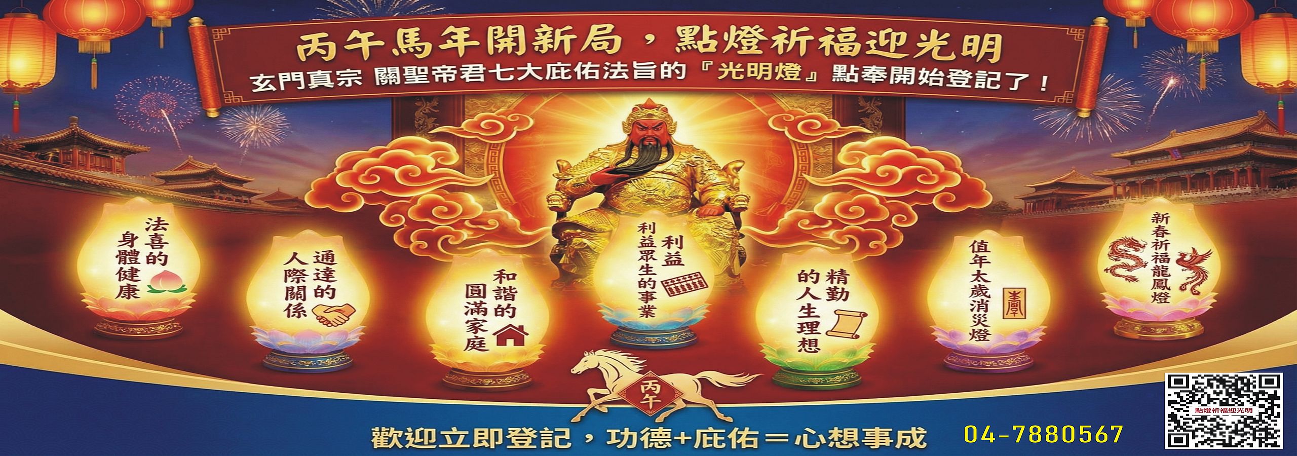 新春將至,為自己與家人預約一整年的順遂!點光明燈祈求諸聖仙佛守護,助您消災解厄、增長智慧、事業亨通。一盞明燈,照亮前程,讓心靈平靜、福氣滿門。名額有限,歡迎儘早登記,讓福光守護您的每一天!